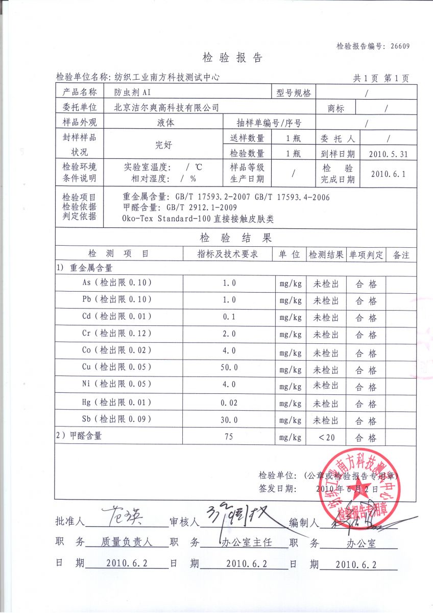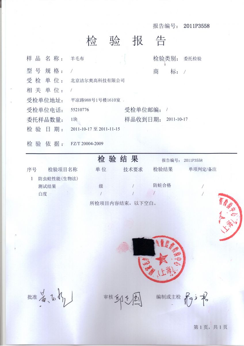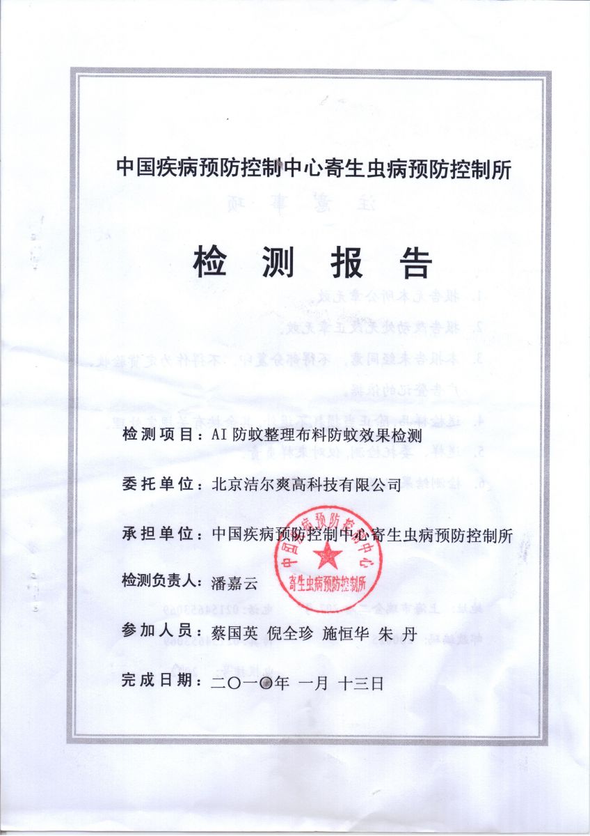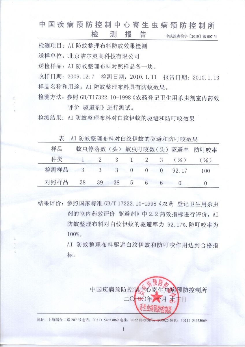 防蚊,防蟲,防蛀整理劑測試報告(軍科院微生物研究所,國家毛紡產品檢驗中心,中國疾控中心寄生蟲所)